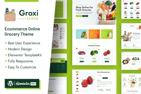 [Elementor Template] Groxi: Create stunning online stores with this premium e-commerce Elementor template. Fully customizable and responsive, Groxi offers a sleek design with multiple pre-designed pages to help you create an online store that stands out. Perfect for businesses of any size, Groxi is a must-have for anyone looking to elevate their e-commerce game.